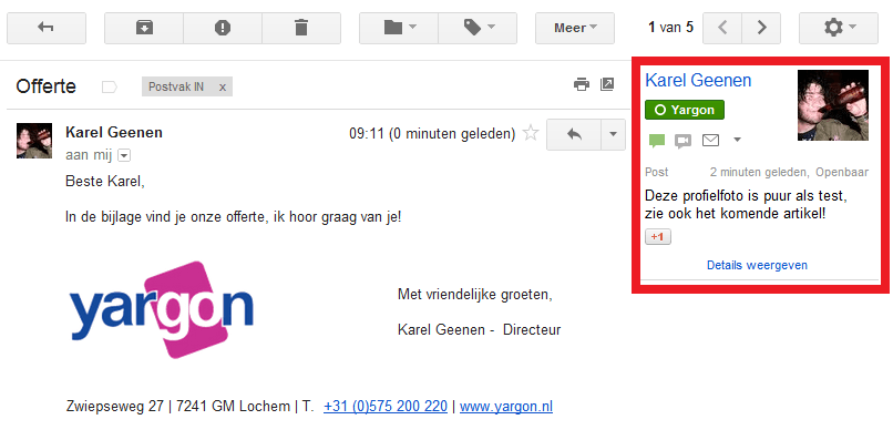 Opgelet: Niet alleen wanneer je mailt vanuit Gmail wordt de extra data weergegeven! Ook wanneer je bijvoorbeeld vanuit een mailsoftware verzend met een afzendadres wat een Google+ profiel heeft wordt de extra data vertoond in Gmail!