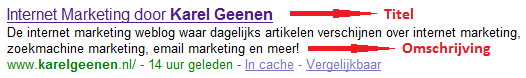 Het tweede interessante is dat we kunnen zien wat het doorklikpercentage is. Met andere woorden, in hoeverre ons zoekresultaat aansluit bij de werkelijke zoekopdracht.Aan de hand van deze informatie kunnen we ons zoekresultaat gaan optimaliseren. Hiervoor hebben we in principe twee dingen die we kunnen aanpassen, de titel en de omschrijving: