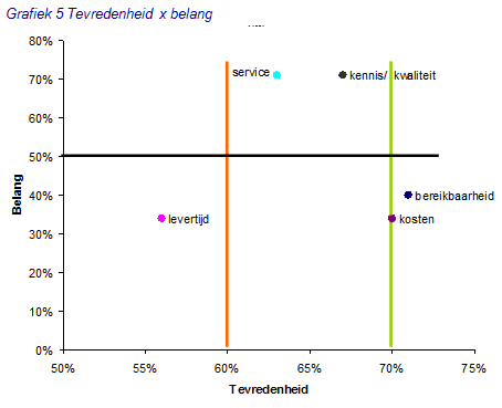 Service en kennis aandachtspuntenVooral kennis/kwaliteit en service zijn aandachtspunten voor webdesign bureaus. Deze kenmerken worden erg belangrijk gevonden, maar men is hier niet bijzonder tevreden over.
