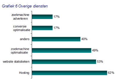 Weinig loyaliteitMaar iets meer dan de helft van de deelnemers zal in de toekomst voor hetzelfde webdesign bureau kiezen. 40% zal dit niet doen.Overige dienstenDe helft (50%) van de uitbesteders heeft ook andere diensten afgenomen. Hierbij gaat het vooral om hosting en website statistieken. Hier is men over het algemeen tevreden over.