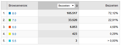 Dat zijn in ons geval dus nog altijd bijna 7000 bezoekers die de website anders zien dan eigenlijk zou moeten.Uiteraard neemt het aantal IE6 gebruikers wel gestaag af, maar toch blijft het onverstandig om deze groep links te laten liggen! Hetzelfde geldt natuurlijk voor IE9. Steeds meer mensen zullen die browser gaan gebruiken, dus je kunt er maar beter voor zorgen dat je website er klaar voor is. Overigens is het mogelijk dat IE9 nog een aantal bugs bevat waardoor de websites niet altijd even goed worden weergegeven, maar dat weet ik dus niet zeker.