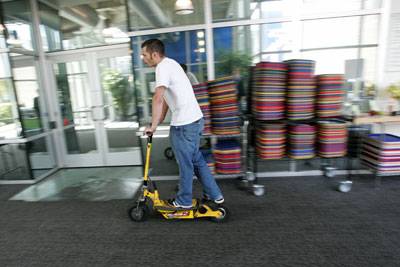 Te moe om te lopen naar de cafetaria? Neem dan een elektrische step ;-)[/caption]By the way, als je te moe bent om naar één van de cafetaria's te lopen neem je toch gewoon een electrische step.Oja, het kost natuurlijk behoorlijk wat, al dat gratis eten. Zo werd 4 jaar geleden al eens berekend dat het gratis eten Google 72 miljoen dollar per jaar kostte... Dat bedrag zal naar verwachting alleen maar zijn gestegen.